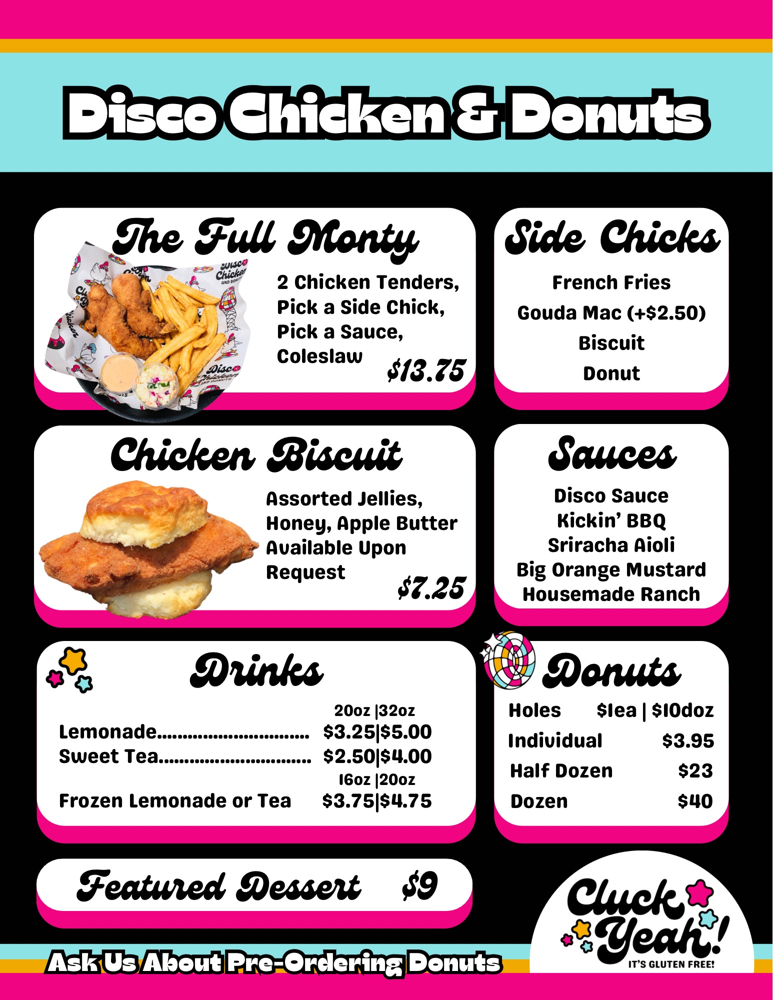 Funky, flavorful, and a little bit retro — Disco Chicken & Donuts brings bold fried chicken tenders, hot wings, and fresh-made donuts together in one unforgettable menu.
